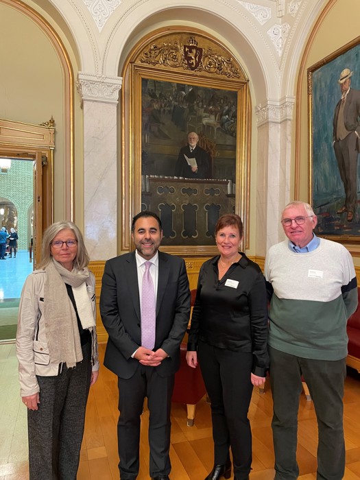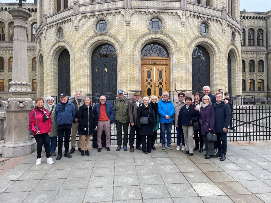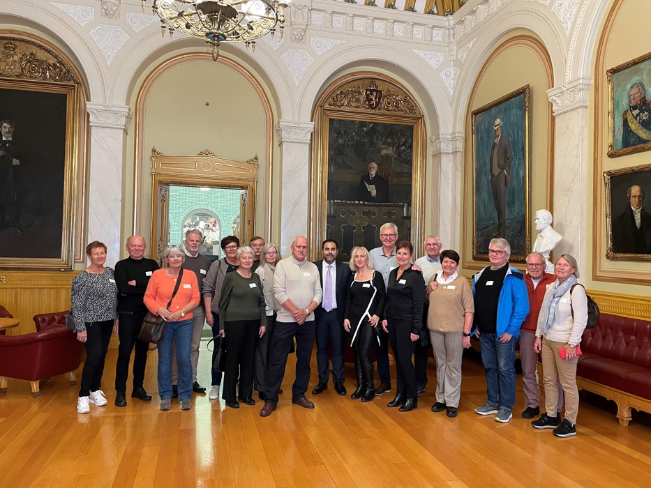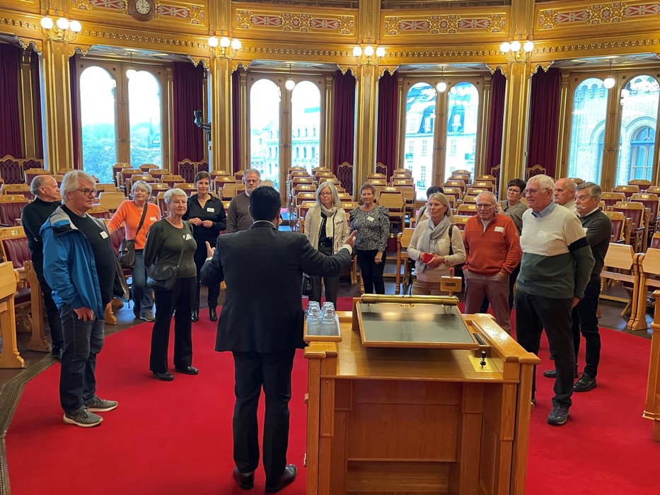 Vi ble møtt av en særdeles blid og omgjengelig Stortingspresident. Masud Gharahkhani orienterte oss om Stortingets historie, gjøremål og oppgaver og de forskjellige saler og rom på en meget interessant måte. I år feirer vi at det er 750 år siden Norge fikk sin aller første riksdekkende lovbok (Magnus Lagabøtes landslov), sa Masud. 1814 var et skjebneår for Norge. Grunnloven av 17. mai 1814 er et spesielt viktig dokument i denne sammenheng. I løpet av året gikk Norge fra å være et land med lite grad av selvstendighet i det dansk-norske riket, til å bli et land med stor grad av selvstyre i en løs union med Sverige. I dag kan vi være meget stolte over dette og hvordan Norge har fått muligheten til å blomstre og til å bli et av de beste landene i verden å bo i, sa Masud.
