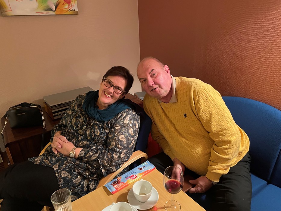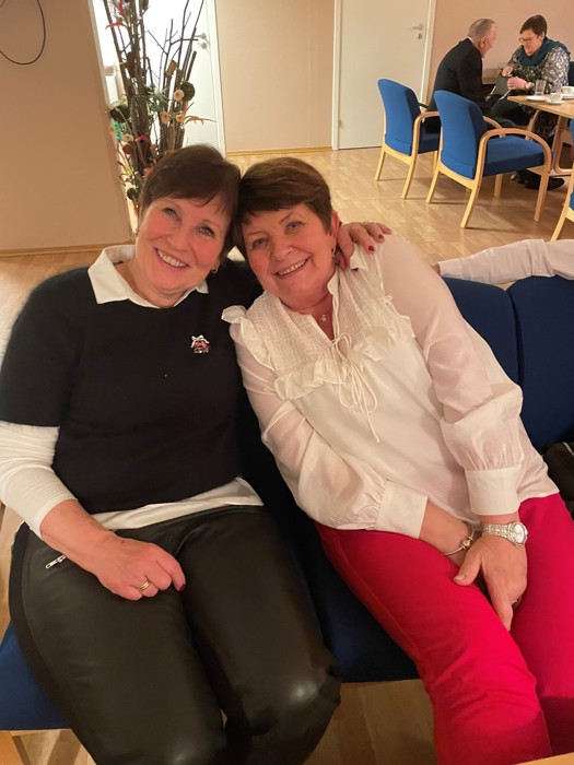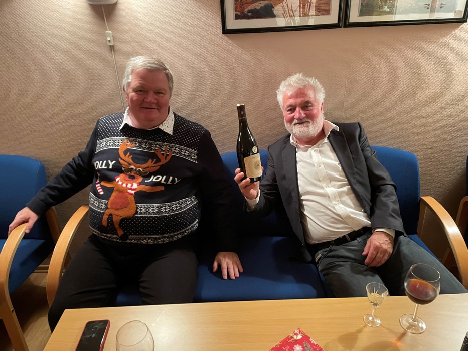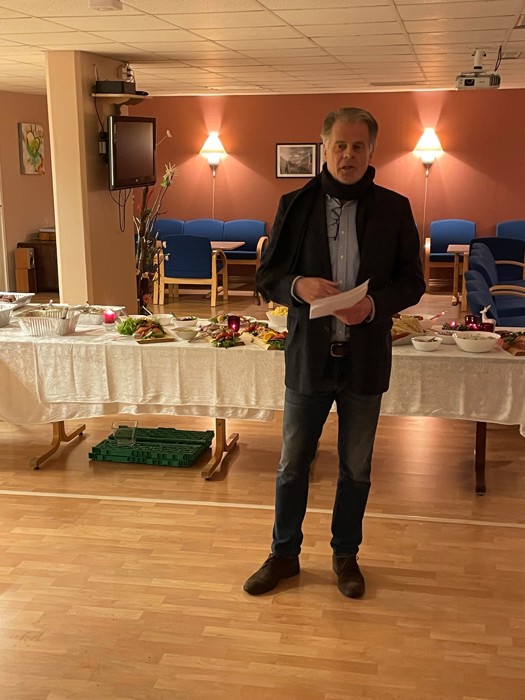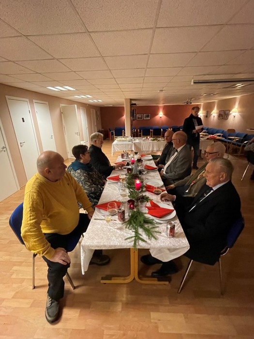 De som var til stede koste seg - veldig. Se bilder av noen. (Foto: Per Anders). Vi var 20 av 28 påmeldte og vi var ganske flinke med å holde avstand. Bord ble satt i avstand fra hverandre. Avstand ble holdt da man forsynte seg med mat, etc. Håper dette har gått bra. Det vurderes å bruke dette stedet flere ganger. Takk til de som ordnet med julebordet, organisering og pynting forut - og rydding. Kastanjeveien ligger høyt opp i Åssiden og er et forsamlingslokale for fire blokker, som vi leide for anledningen.